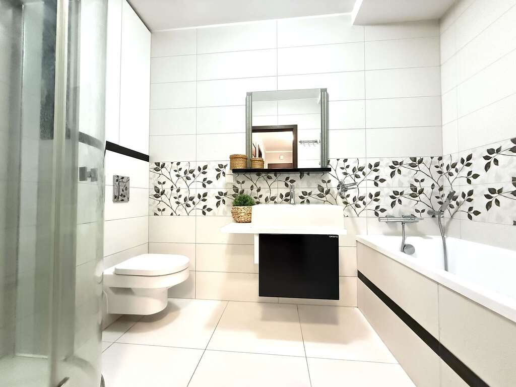 Łazienka duża wyposażona w wannę, prysznic i WC.