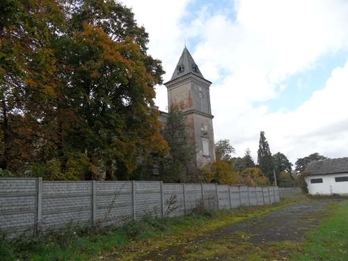 Działka ogrodzona siatką metalową , z wjazdem od wschodu- przez dziedziniec folwarczny.