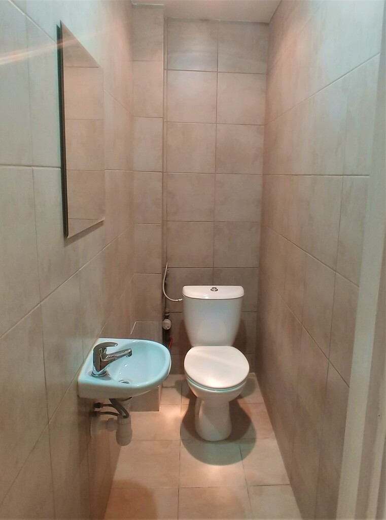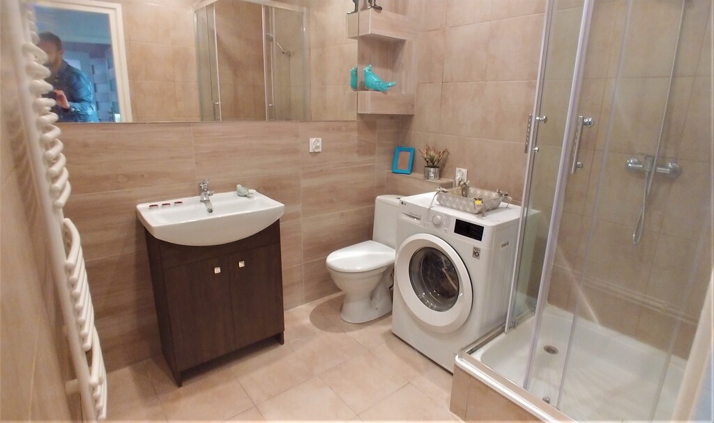 Na podłodze panele oraz kafle, ściany gładzone malowane.