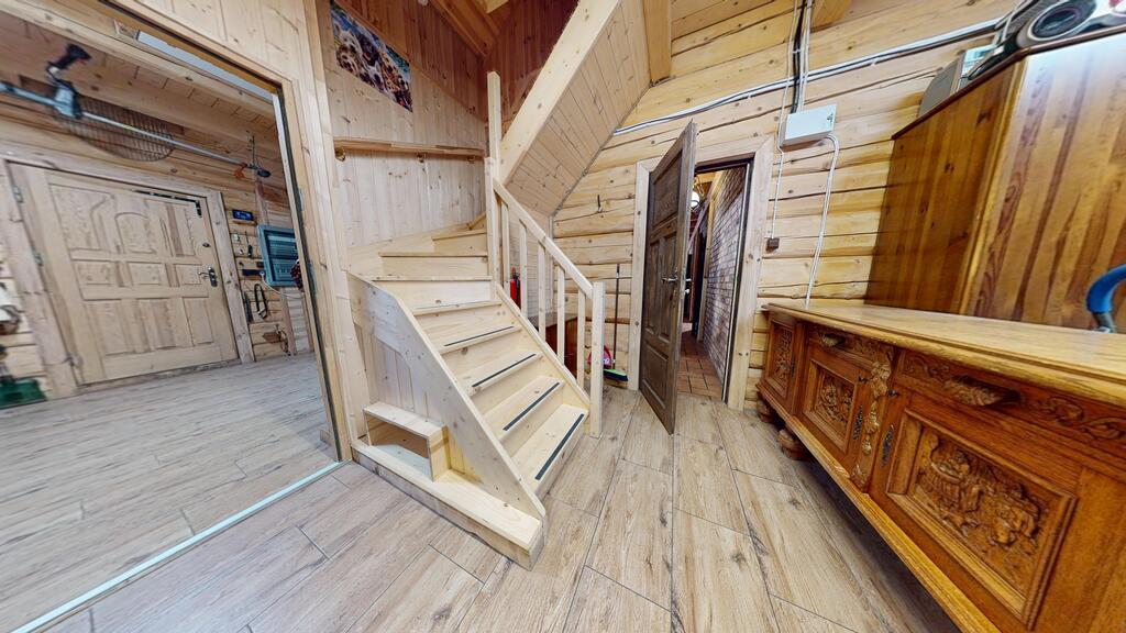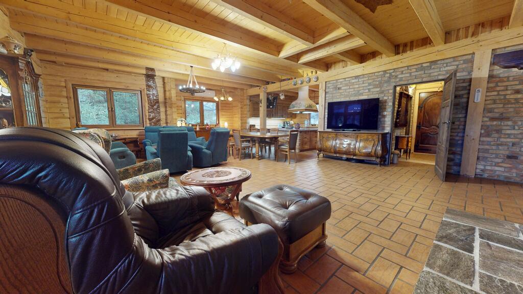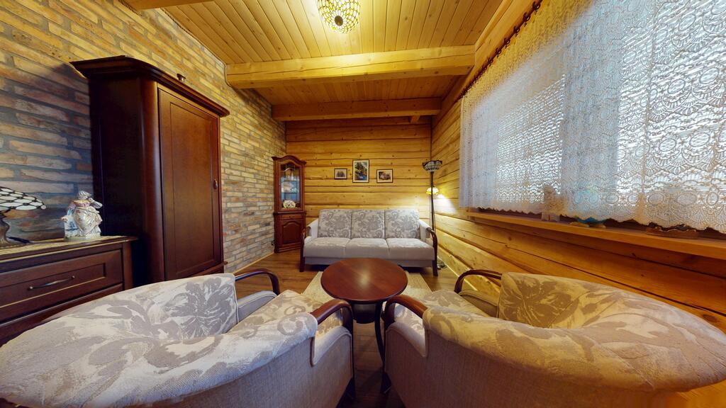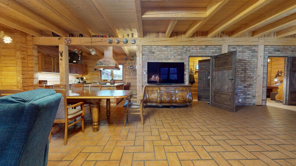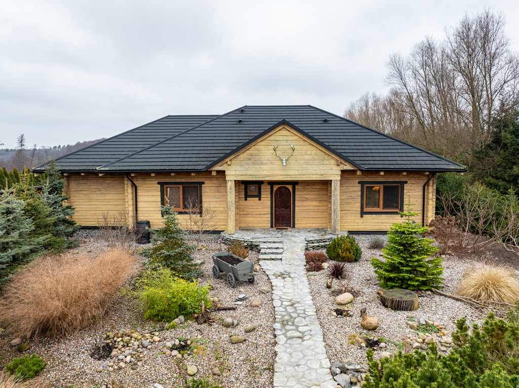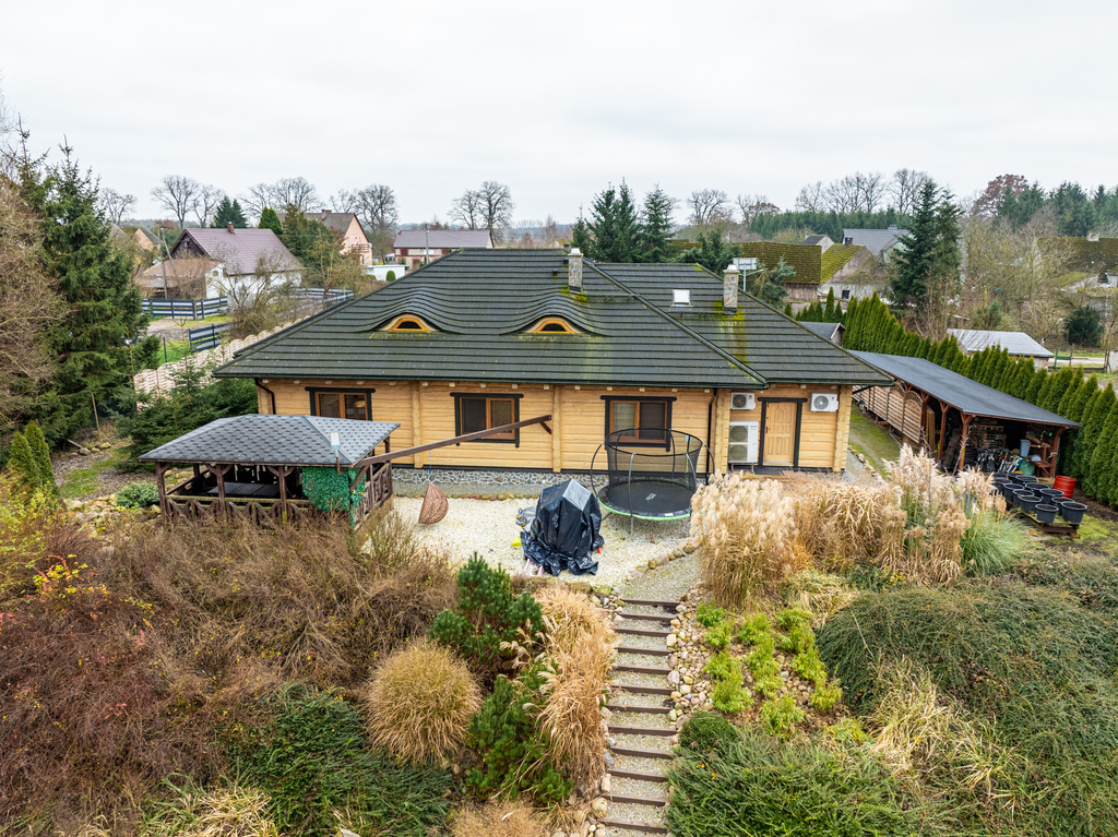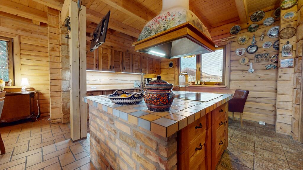Punkt centralny stanowi wolnostojący dom jednorodzinny, chata polska:) wybudowany i oddany do użytkowania w 2019 roku. Posadowiony w konstrukcji drewnianej, wykonany z bali o grubości 22 cm zapewnia bardzo dobrą izolację termiczną oraz zdrowy mikroklimat wnętrz, piękny dobrze zaizolowany dach.
