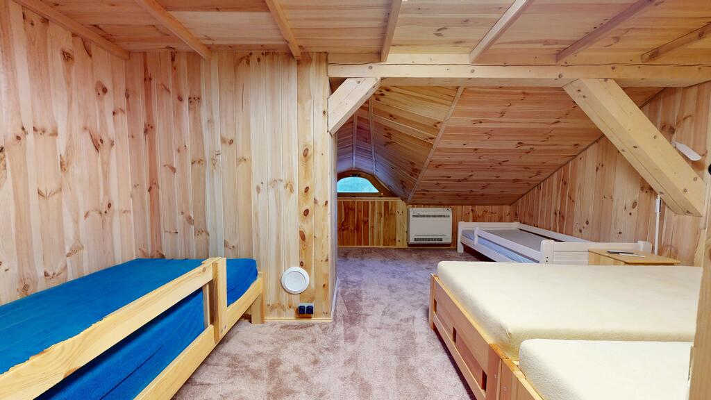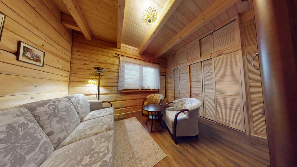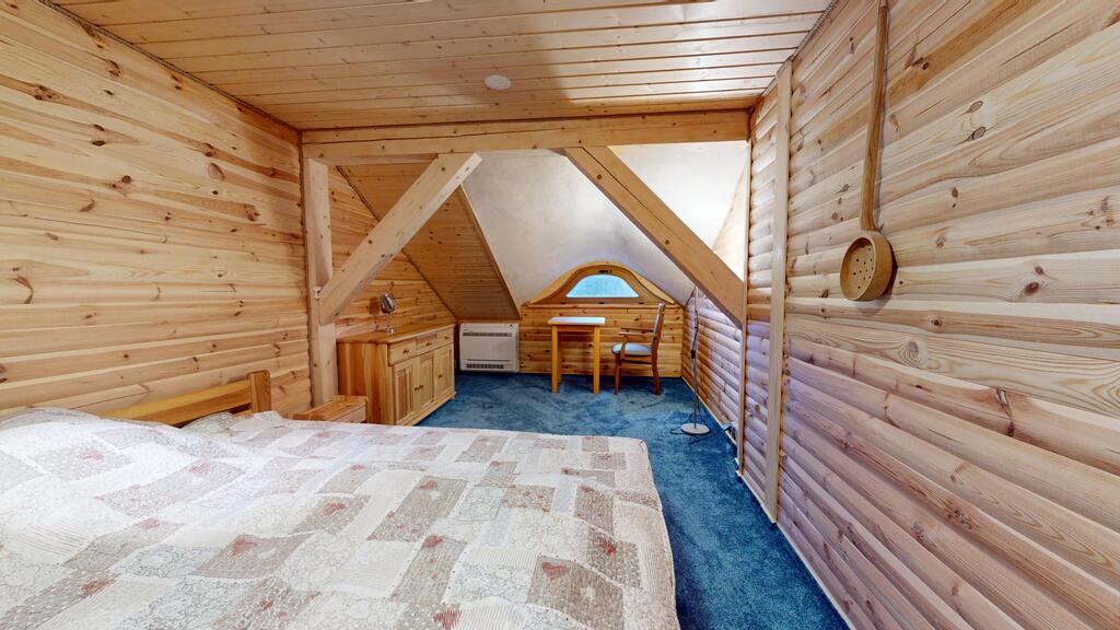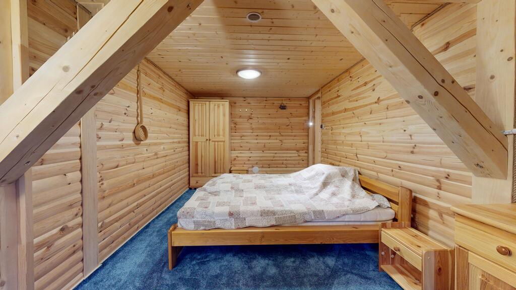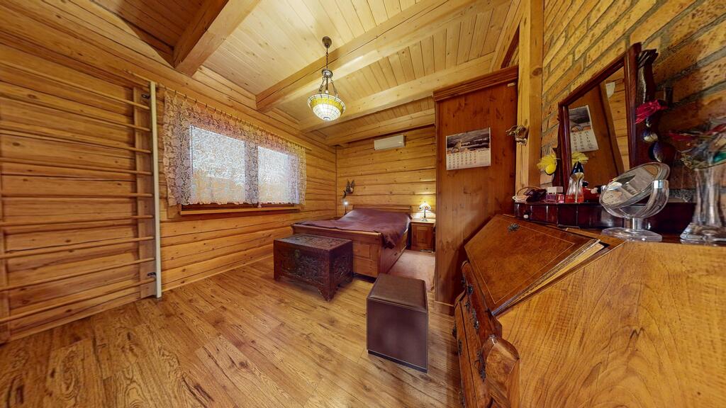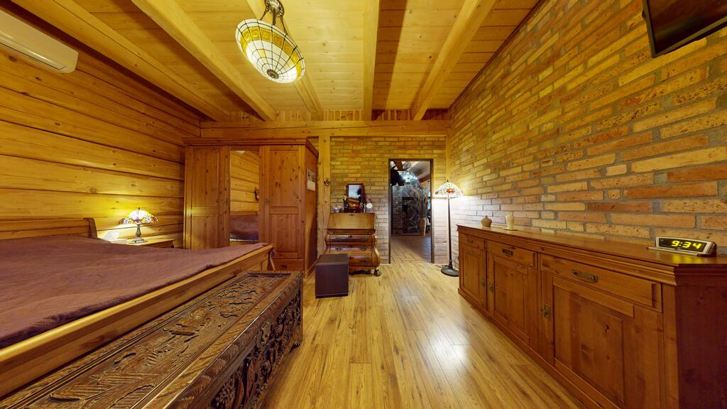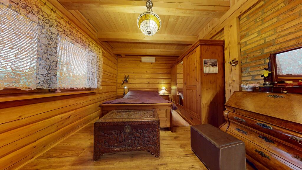 Punkt centralny stanowi wolnostojący dom jednorodzinny, chata polska:) wybudowany i oddany do użytkowania w 2019 roku. Posadowiony w konstrukcji drewnianej, wykonany z bali o grubości 22 cm zapewnia bardzo dobrą izolację termiczną oraz zdrowy mikroklimat wnętrz, piękny dobrze zaizolowany dach.