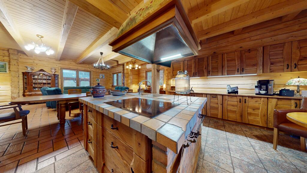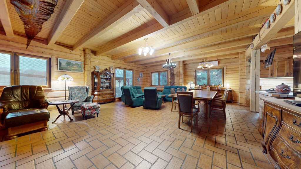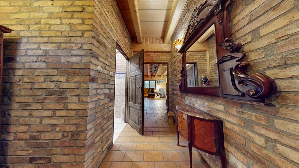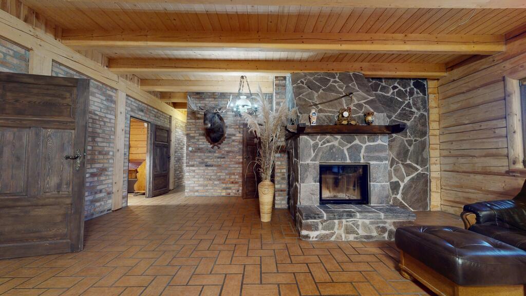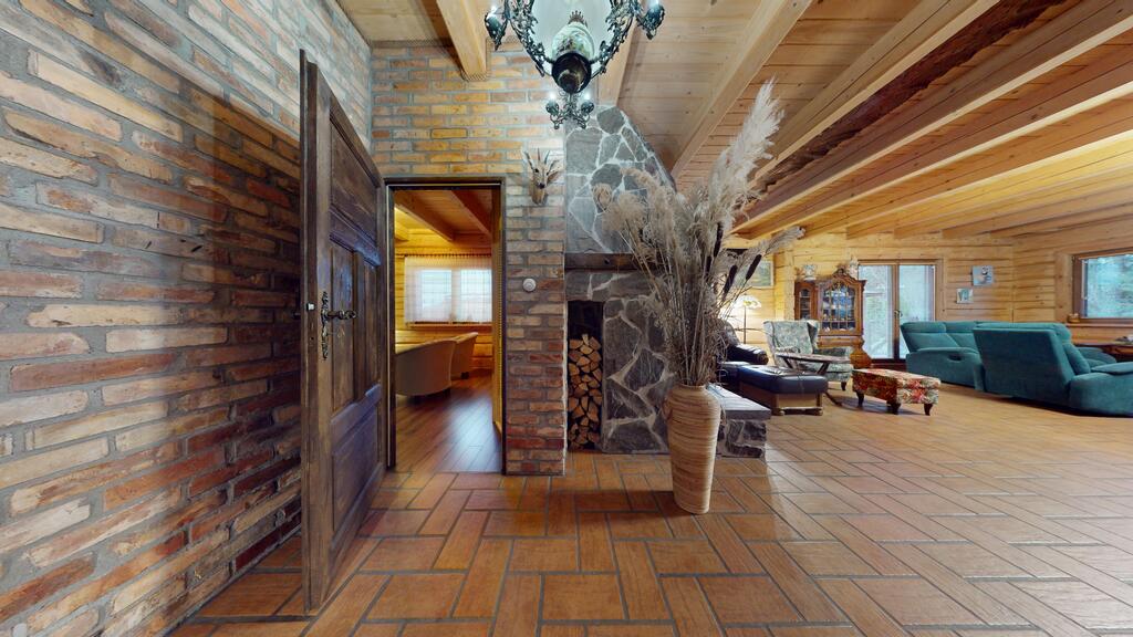 Powierzchnia użytkowa to ponad 220m² gdzie sercem domu jest przestronny, reprezentacyjny salon połączony z kuchnią, urządzony w staropolskim klimacie. Szczególną uwagę zwraca efektowny kominek, stanowiący kluczowy element wnętrza, nadając mu wyjątkowego charakteru z przytulną atmosferę oraz ciepłem domowego ogniska - foto.