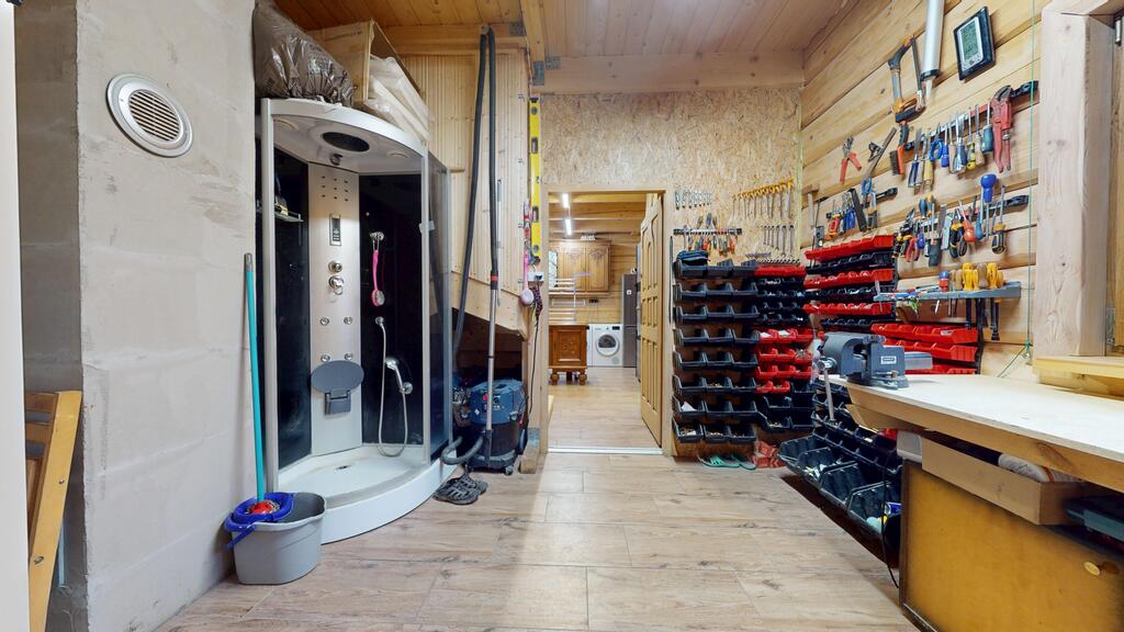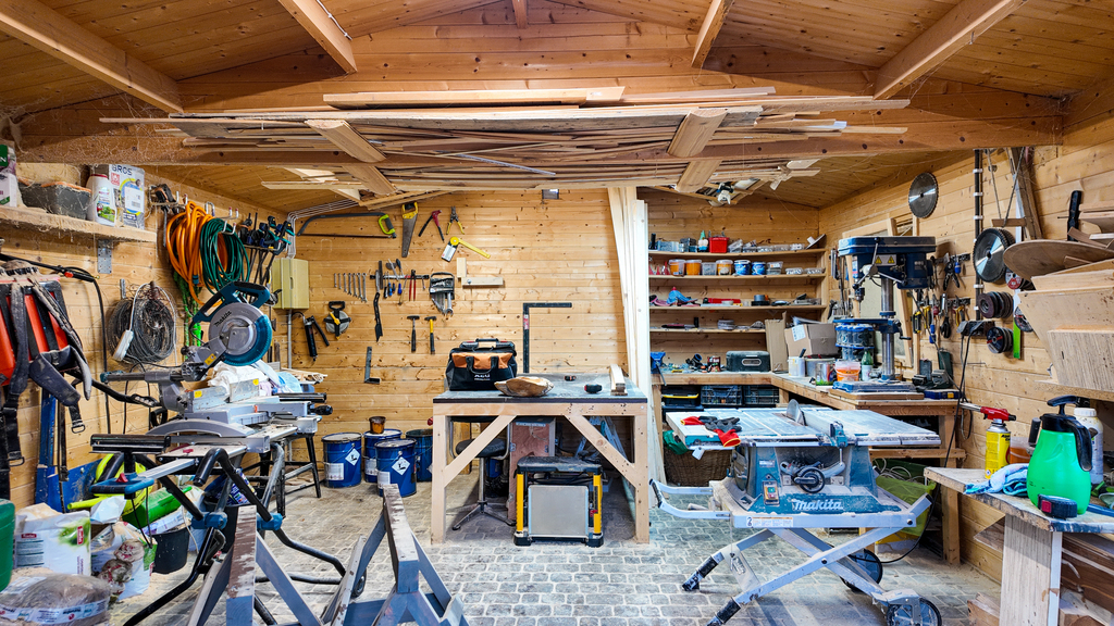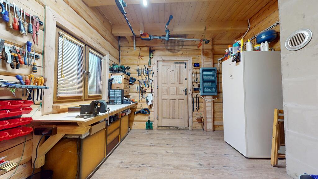 Na terenie posesji znajdują się także duża drewutnia 50 m² , profesjonalny warsztat stolarski oraz reprezentacyjny domek letniskowy 50 m² na d stawem. Przed domem zlokalizowana jest wiata z trzema zadaszonymi miejscami postojowymi.