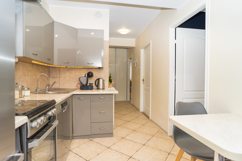 Mieszkanie ma w pokojach ściany gładzone i malowane, na podłogach panele. W przedpokoju, łazience i kuchni na podłodze gres, na ścianach (łazienka i kuchnia) glazura .