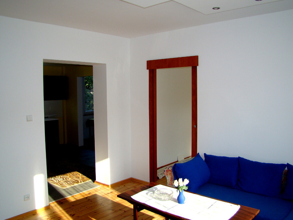 Mieszkanie na wysokim parterze składa się z dwóch pokoi (16 i 15 m2), jeden przechodni, widnej kuchni (11), jadalni (5) i łazienki z wc (5). Mieszkanie po remoncie. W pokojach na podłogach deski, ściany wygładzone i pomalowane. W kuchni na podłodze terakota, nowa zabudowa meblowa wraz ze sprzętem AGD. W łazience podgrzewane podłogi, kabina prysznicowa, wc, umywalka.