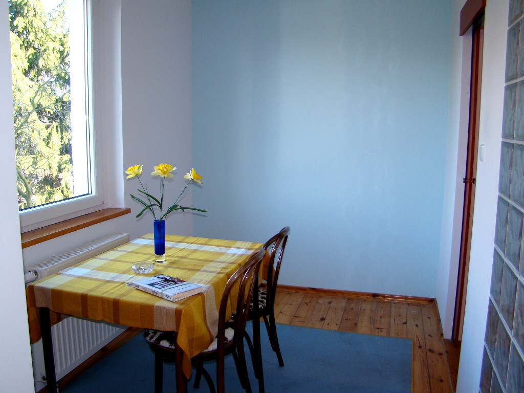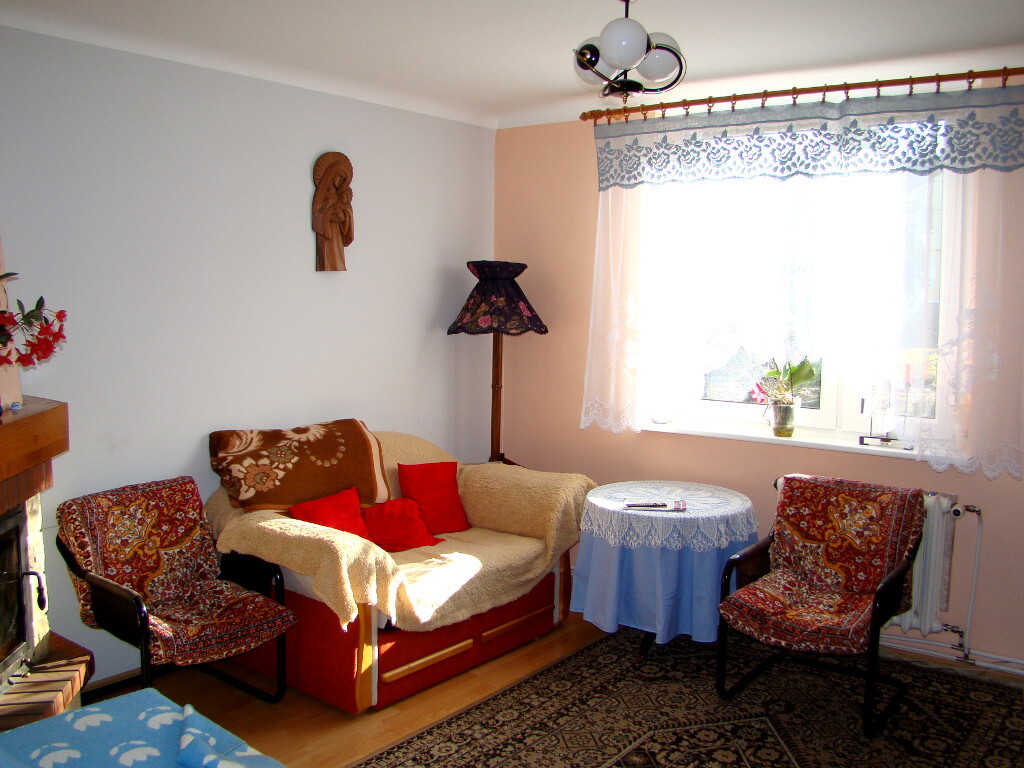 Na piętrze drugie mieszkanie - pokój z kominkiem, sypialnia, kuchnia, łazienka.
