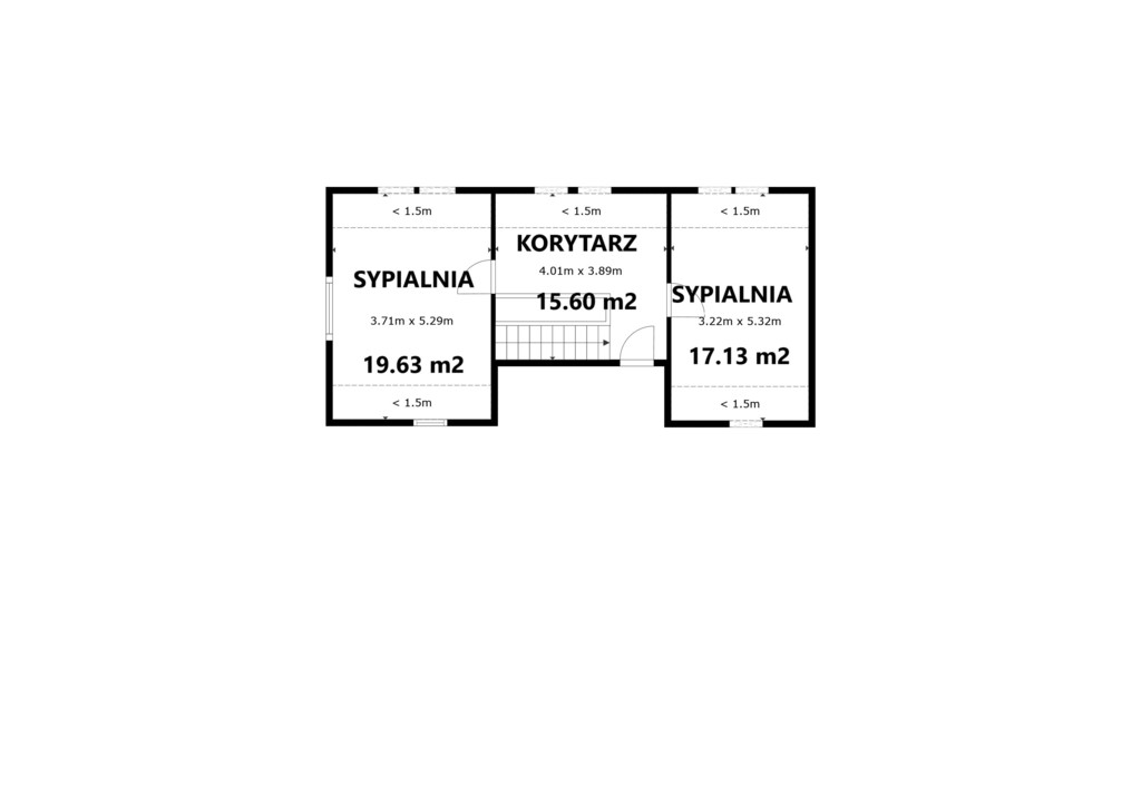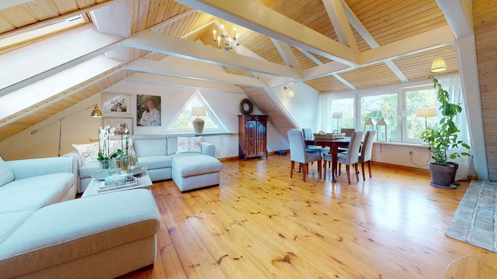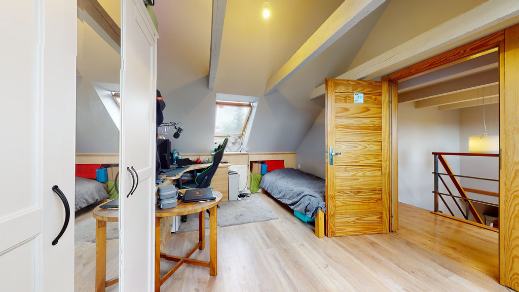 Część mieszkalną znajdującą się na piętrze i poddaszu tworzą: