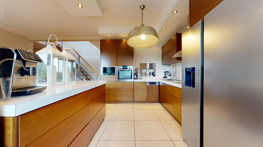 Część mieszkalna jest nietuzinkową i zjawiskową nieruchomością w której dominuje drewno w różnych jego odsłonach. Użyte do wykończenia materiały są wyselekcjonowane a meble przeważnie wykonane na wymiar. Duszą i centralnym miejscem domu jest jadalnia z otwartą kuchni, gdzie spotykają się domownicy. Do relaksu służą salon i duży, zadaszony taras. Ostatni poziom jest prywatną przestrzenią właścicieli.
