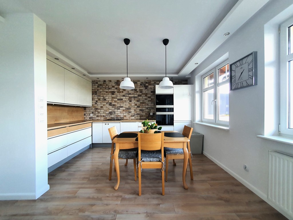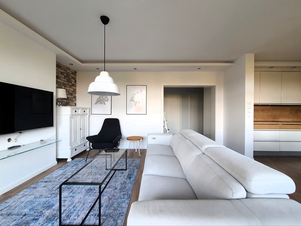 Idealne dla wymagającej rodziny, oficerów korpusu NATO lub biznesmenów prowadzących interesy w Szczecinie Mieszkanie składa się z: - przestronnego salonu z aneksem wyposażonego w wysokiej klasy sofę z funkcją relaks, TV LCD Samsung, funkcjonalne komody, fotel i stolik kawowy. Pomieszczenie jest bardzo przestronne, doświetlone przez dwa bardzo duże okna oraz drzwi podwójne balkonowe wyposażone w elektrycznie sterowane rolety antywłamaniowe. Aneks posiada zabudowę na wymiar, a na wyposażeniu markowe sprzęty AGD (lodówko-zamrażarka, piekarnik, płyta indukcyjna, zmywarka). Między aneksem a salonem znalazło się również miejsce na stół jadalniany z czterema krzesłami. Na wyposażeniu kuchni znajdziemy kubki, szklanki, zastawę stołową, sztućce, garnki itp.