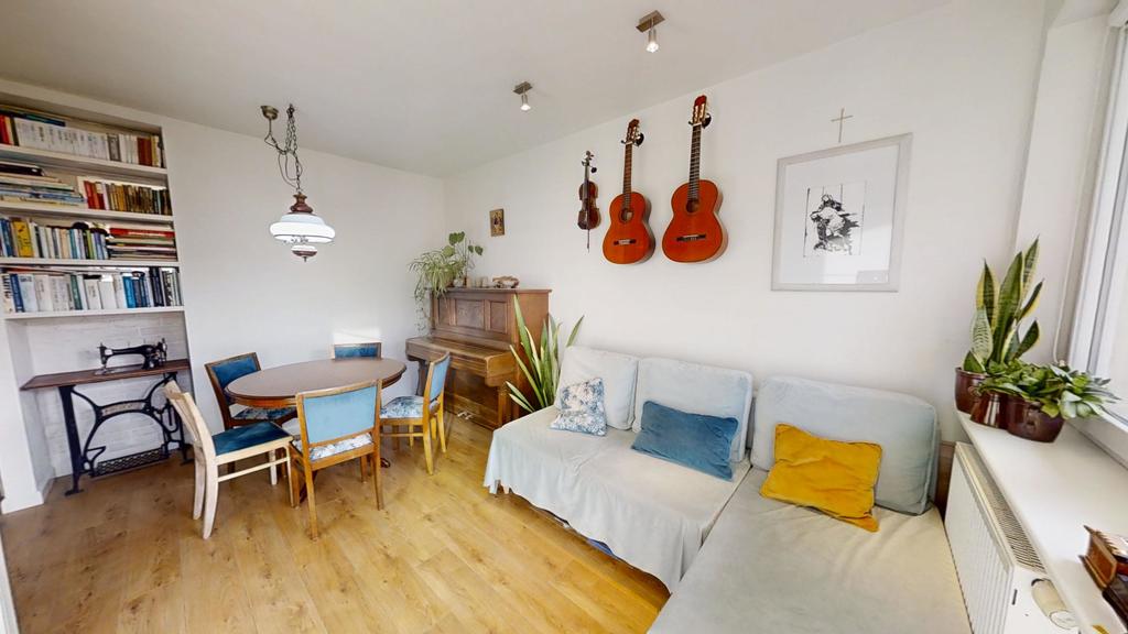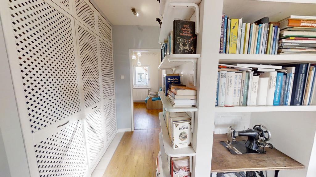 Mieszkanie pierwotnie było dwupokojowe - w chwili obecnej przystosowane przez architekta do potrzeb rodziny 4-osobowej. Jeden z pokoi został przedzielony lekką ścianką z płyt g-k, niewielkim nakładem kosztów można powrócić do stanu pierwotnego. Mieszkanie zaprojektowane z dbałością o ergonomię i zachowanie poczucia przestronności: w korytarzach szafy, wykorzystujące całą wysokość pomieszczeń, aranżacja kuchni oparta na wygodnym systemie szufladowym. Specjalnie zaprojektowany układ ścian mieści z jednej strony biblioteczkę, z drugiej - szafę gospodarczą.