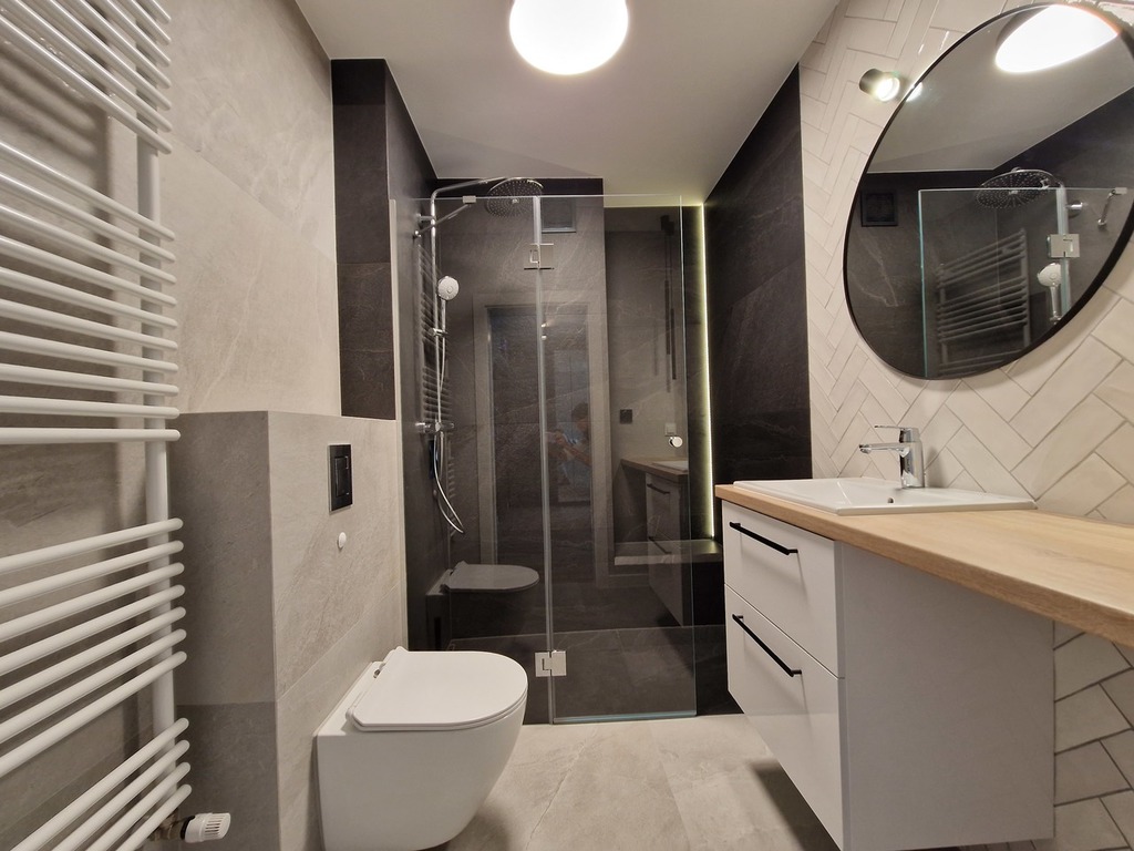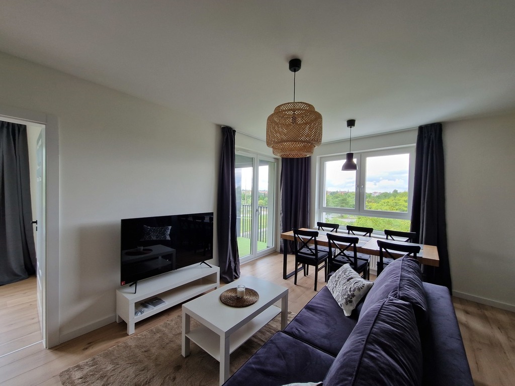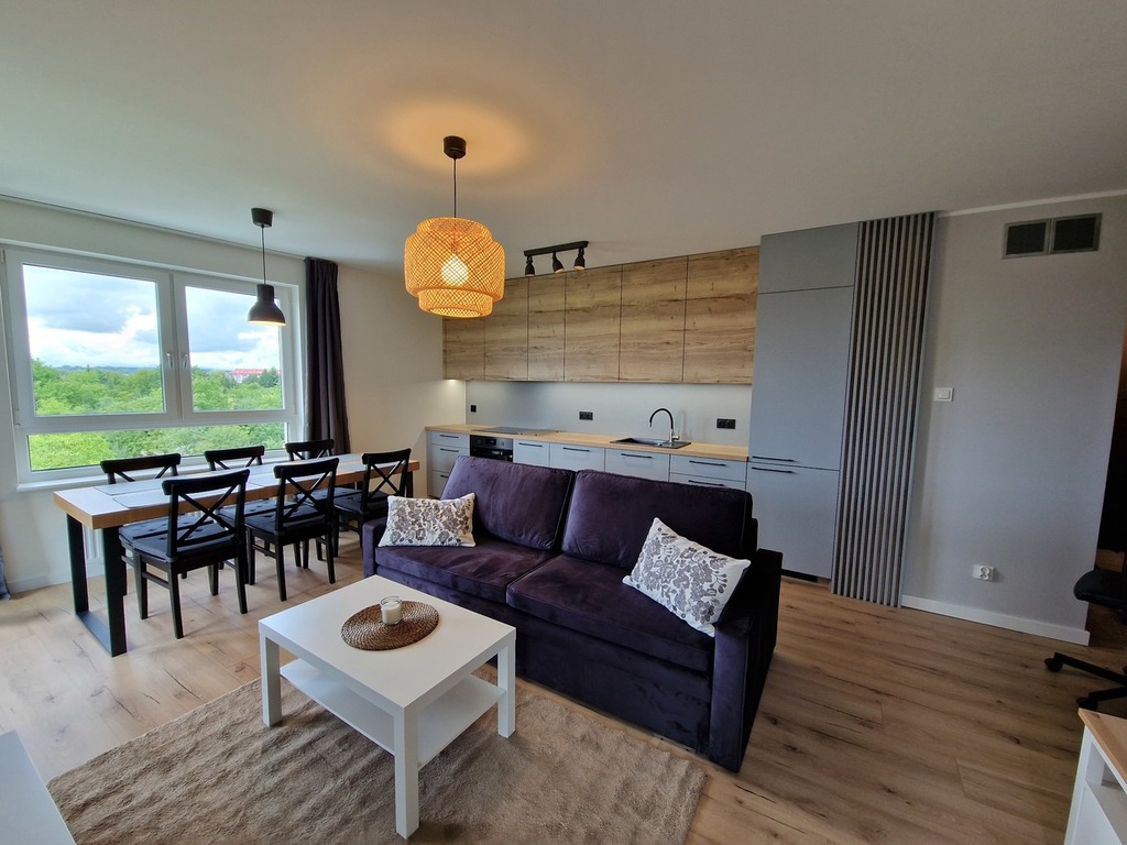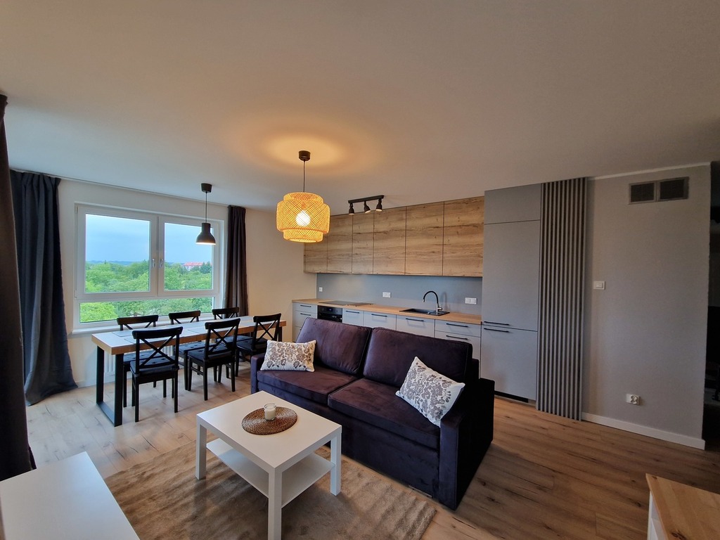 Lokum składa się z trzech słonecznych pokoi, które dzięki południowej ekspozycji okien są doskonale doświetlone przez cały dzień. Kuchnia jest wyposażona w nowoczesny sprzęt AGD, a w salonie znajduje się telewizor. Wszystkie pomieszczenia są wykończone w wysokim, atrakcyjnym standardzie.