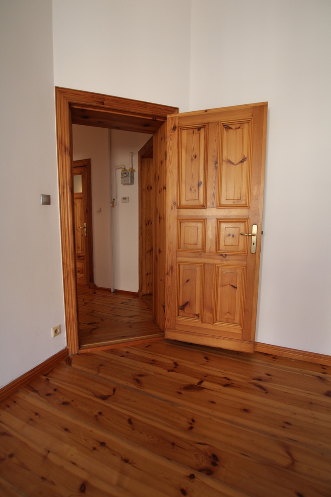 Stylowe wykończenie – oryginalne drewniane drzwi po renowacji, deski na podłogach, a w kuchni i garderobie nowoczesne panele.