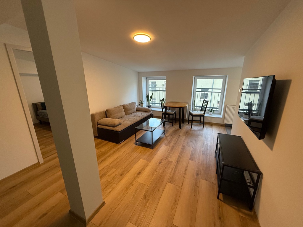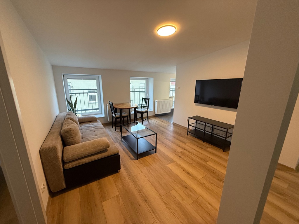 Salon: rozkładana kanapa, stolik kawowy, telewizor i szafka rtv, stolik z krzesłami,