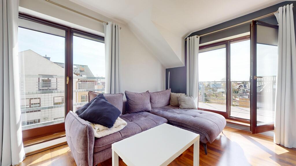 Usytuowanie mieszkania na szczytowym piętrze w budynku, położonym wyżej niż sąsiadujący, daje nam poczucie prywatności oraz pozwala zrelaksować się na tarasie podziwiając panoramę okolicy.